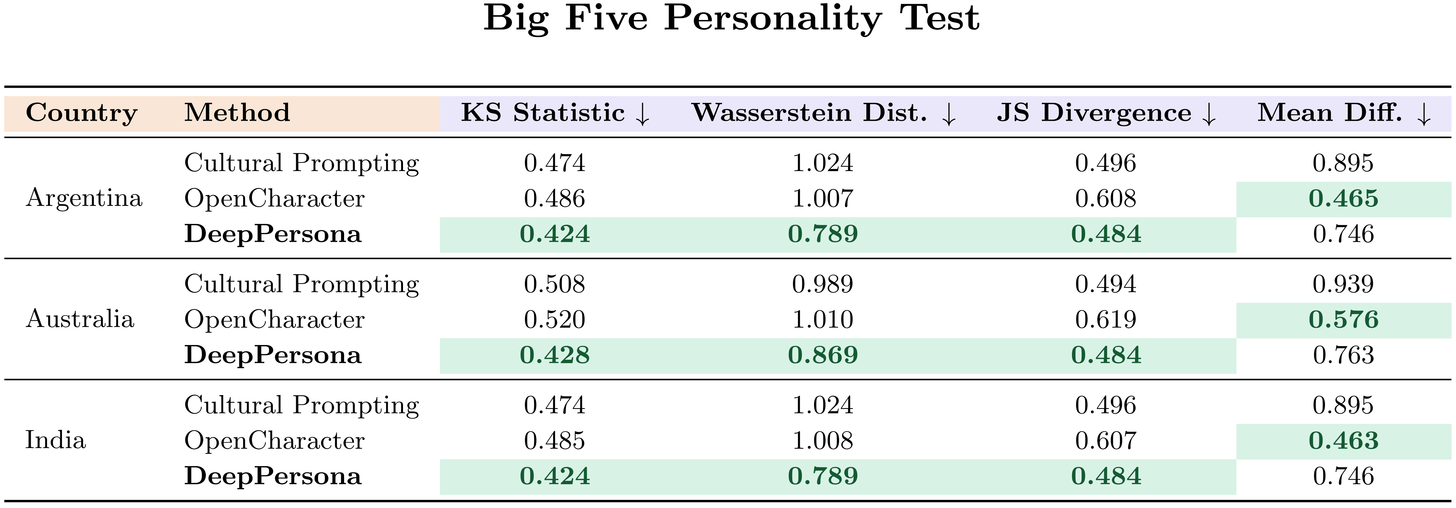 Result Figure 2. Comparison across countries shows that DeepPersona consistently attains the lowest KS, Wasserstein, JS Divergence, and Mean Difference values, indicating superior alignment with real human personality distributions and enhanced psychological fidelity.